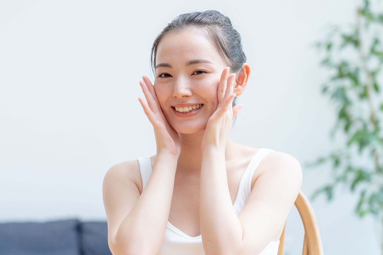 ④顔全体に化粧水をつけられたら、手のひらで顔を包み込むようにして
